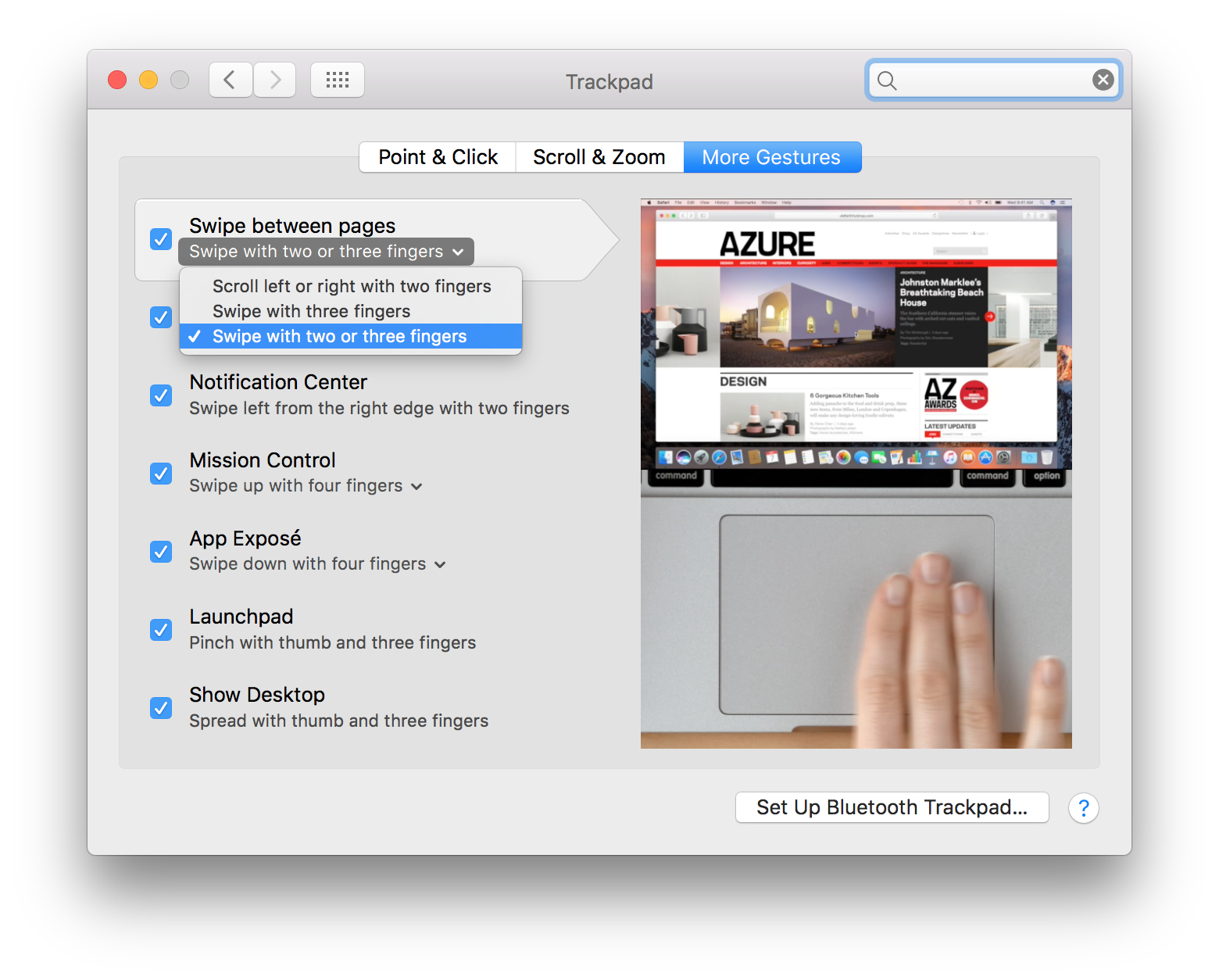 For several years, the standard navigation gesture in macOS has been the two-finger drag: snazzy, but mostly limited to Safari and a few other apps. However, a legacy three-finger swipe can be additionally enabled in Trackpad preferences, and while it's not nearly as flashy as its younger brother, it works far more universally across the OS. Under the hood, this gesture is basically free to implement: all you have to do is include a swipeWithEvent: selector in your view controller or responder and you're good to go. Then, if the user performs a three-finger swipe with the cursor over your view, it triggers the selector and presumably navigates in the corresponding direction.